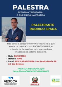 A Associação de Serviços Contábeis de Carapicuíba (Aescca), o Sindicato dos Contabilistas de São Paulo (Sindcont-SP) e a Associação Comercial e Industrial de Carapicuíba (ACIC) realizam na quarta-feira, 08 de abril, às 16h, a palestra “Reforma Tributária: o que muda na prática.