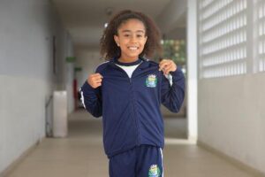 Além do material escolar, os estudantes recebem um kit de uniforme composto por calça, duas bermudas, jaqueta, três camisetas, uma regata, uma camiseta de manga longa e três pares de meias.