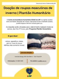 O Centro de Assistência Humanitária (CEAH) da Legião da Boa Vontade (LBV) na capital paulista está solicitando doações de roupas masculinas novas e também usadas, porém limpas e em bom estado para uso.