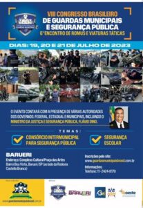 O Consórcio Intermunicipal da Região Oeste Metropolitana de São Paulo (CIOESTE), juntamente com o Conselho Nacional das Guardas Municipais, o Instituto AGM Brasil, a Prefeitura de Barueri, outras entidades realizadoras e apoiadoras, realizam, nos dias 19, 20 e 21 de julho de 2023, o VIII Congresso Brasileiro de Guardas Municipais e Segurança Pública. O evento acontecerá no Complexo Cultural Praça das Artes, localizado na Rua Ministro Rafael de Barros Monteiro, nos dias 19, 20 e 21 de julho de 2023 255, Jardim dos Camargos, Barueri-SP.