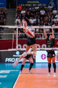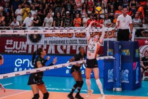 O banho de água fria no primeiro set acordou as osasquenses. Com Bianca Cugno fazendo estrago no saque – com direito a ace no 8/1 – e o bloqueio funcionando, as donas da casa foram abrindo vantagem na segunda parcial. Jenna Gray arrancou outro ponto direto no serviço: 13/4. E Maira repetiu a dose: 16/5. O 20/8 e o 21/9 vieram com ataques da oposta argentina, batendo do fundo de quadra. E foi de Bianca, desta vez com um bloqueio, o ponto final: 25/10.