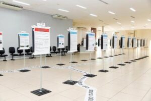 O saguão do Centro de Eventos recebeu painéis com resumos dos trabalhos apresentados, organizados em “Introdução e Justificativa”, “Objetivo”, “Metodologia”, “Resultados” e “Considerações Finais”. Os materiais estavam ilustrados e bem fundamentados, alguns com formato semelhante ao de trabalhos acadêmicos.
