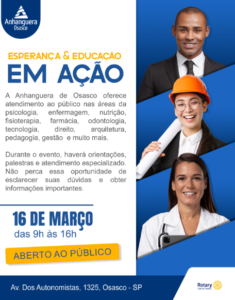A Faculdade Anhanguera Osasco promove mutirão de serviços e cursos gratuitos abertos ao público, no dia 16 de março, presencialmente na instituição, das 09h às 16h.