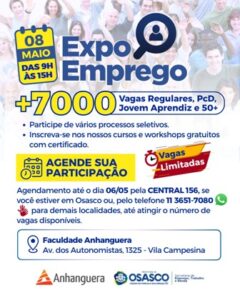Na sexta-feira, 08 de maio, das 09 às 15h, a Prefeitura de Osasco, por meio da Secretaria de Emprego, Trabalho e Renda (SETRE), realizará mais uma edição da Expo Emprego, a primeira de 2026. Essa edição, em comemoração ao Dia do Trabalhador, acontecerá na Faculdade Anhanguera, localizada na Avenida dos Autonomistas, 1325 – Vila Campesina.