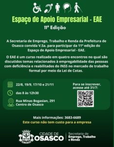 A Prefeitura de Osasco, através da Secretaria de Emprego, Trabalho e Renda (Setre), promove, a partir de agosto, a 11ª Edição do Espaço de Apoio Empresarial. Trata-se de um curso destinado às empresas que precisam cumprir a Lei 8213/91, popularmente chamada de Lei de Cotas, ou as que querem se tornar mais inclusivas, contratando pessoas com deficiência, mesmo que não estejam precisando cumprir a citada lei, mas que ainda têm dúvidas sobre como se dá essa contratação ou como se dá a inclusão deste profissional no ambiente laboral.