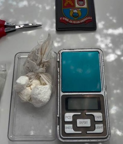 Na busca pessoal, ao verificar o interior da bolsa, foi localizado uma sacola contendo substâncias ilícitas, uma faca e uma balança de precisão.