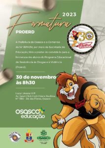 A Secretaria de Educação da Prefeitura de Osasco, em parceria com a Polícia Militar do Estado de São Paulo (por meio do Departamento de Polícia Comunitária e Direitos Humanos) e o 14º Batalhão de Polícia Militar, realizará nessa quinta-feira, 30 de novembro, às 08h30, na Arena Vip, a cerimônia de diplomação dos alunos da rede municipal de ensino que participaram do Programa Educacional de Resistência às Drogas e à Violência (Proerd).