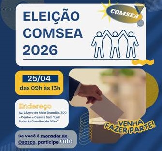 A Prefeitura de Osasco, por meio da Secretaria Executiva de Segurança Alimentar e Nutricional, Sustentabilidade e Inovação Social (SESAN), promove, neste sábado, 25 de abril de 2026, a eleição para composição do Conselho Municipal de Segurança Alimentar e Nutricional (COMSEA), instância fundamental de participação social das políticas públicas de segurança alimentar, combate à fome e promoção da alimentação adequada no município. A votação ocorrerá das 09h às 13h, na Sala Osasco – Sala Luiz Roberto Claudino da Silva, situada na Avenida Lázaro de Melo Brandão, 300 – Centro.