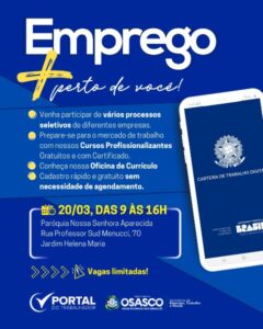 A cidade de Osasco, conhecendo a importância em oferecer oportunidades de trabalho, realiza várias ações neste sentido em conjunto com diversas empresas transformando o sonho de quem busca conquistar o seu emprego em uma nova realidade. Assim, a prefeitura de Osasco promove o projeto “Emprego + Perto de Você”.