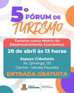 O município de Várzea Paulista sedia, na terça-feira, 28 de abril, a partir das 13h, o 5º Fórum da Região Turística Negócios & Cultura, com o tema “Turismo como Motriz do Desenvolvimento Econômico”.