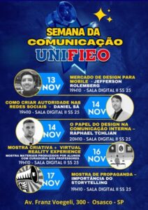 O Centro Universitário Fieo (UNIFIEO) apresenta sua tradicional Semana da Comunicação de 13 a 17 de novembro com palestras e mostras voltadas para alunos e comunidade em geral. No evento serão realizadas palestras e mostras sobre Design para mobile, Design interno, Fotografia, Propaganda entre outros.